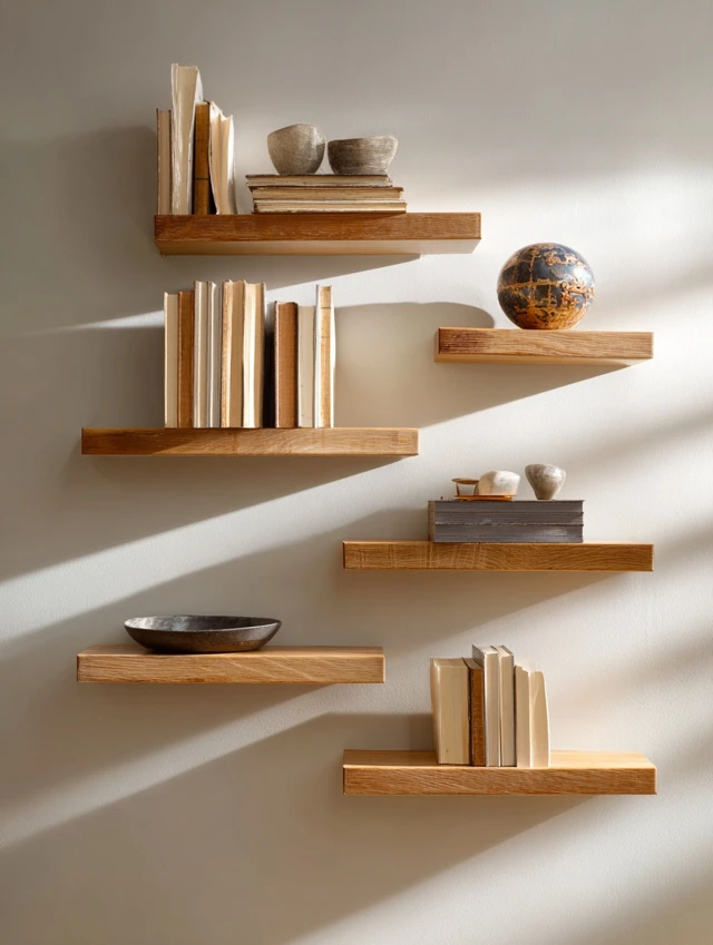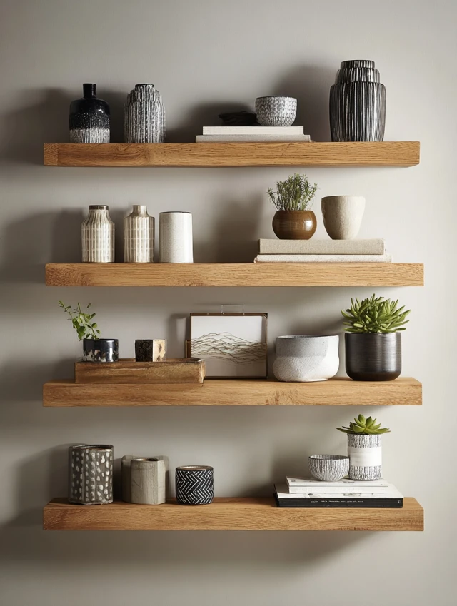 - Use wooden or neutral-colored shelves.