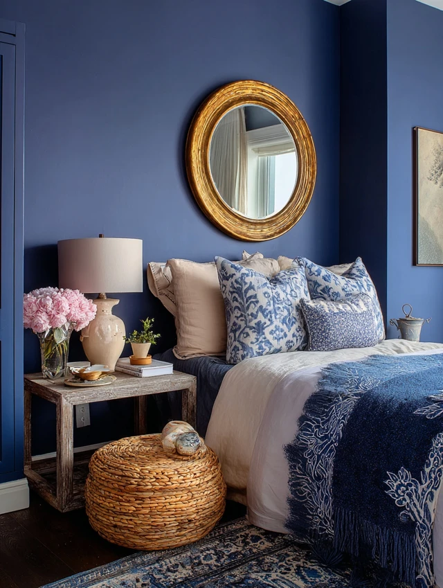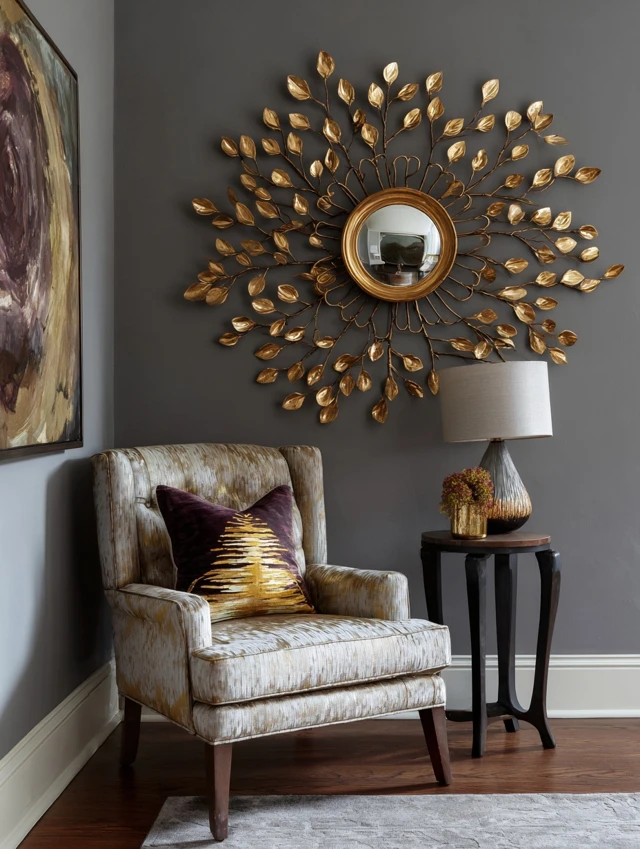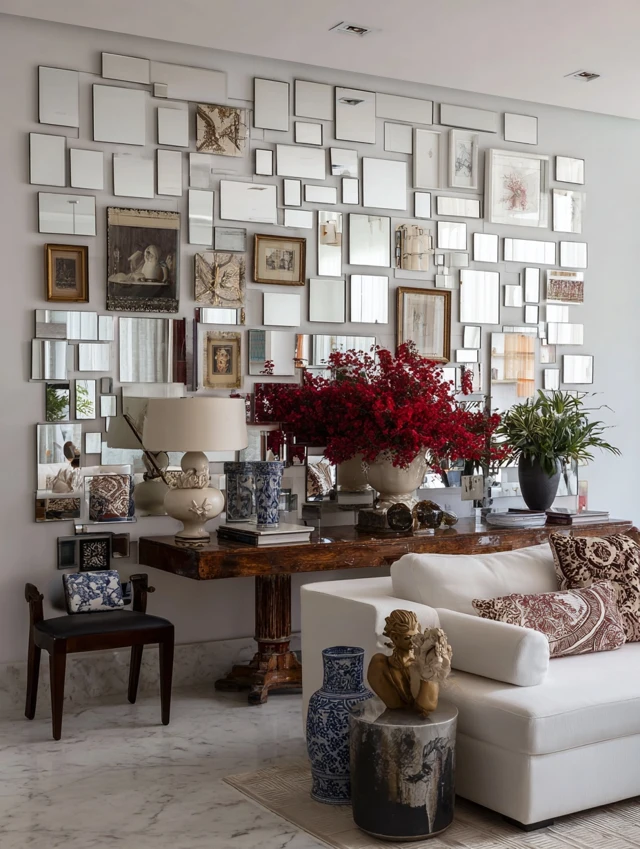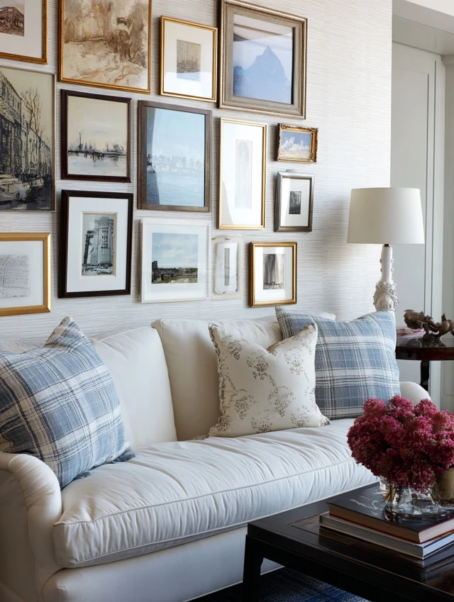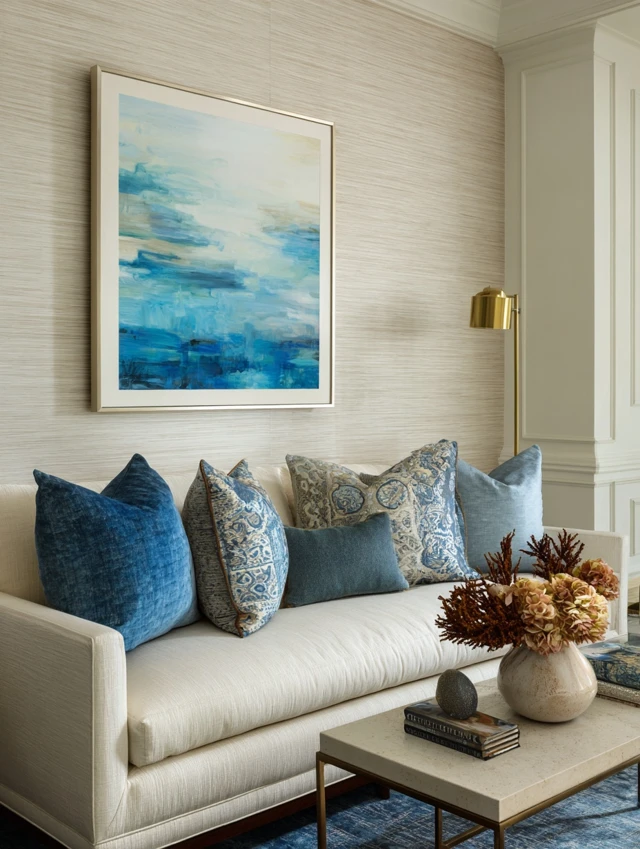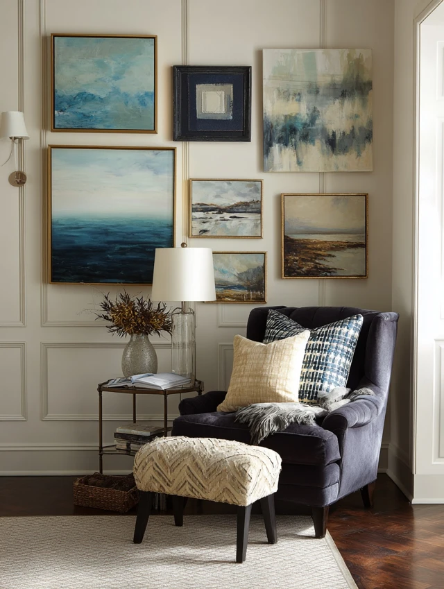 - Layer with framed art or shelves for depth.