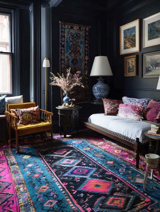- Layer small rugs for depth.